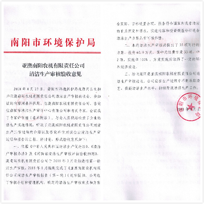 823日南陽市清潔生產(chǎn)審計中心攜權(quán)威認證專家對我公司清潔生產(chǎn)情況進行審核,會議上,專家對我公司清潔生產(chǎn)情況給予高度評價,一致認定亞澳農(nóng)機通過清潔生產(chǎn)審核,同時也為公司后續(xù)清潔生產(chǎn)提出一定要求及需改進的地方。我公司副總表示,接受專家們的建議,后續(xù)公司在清潔生產(chǎn)方面也將不斷改進。