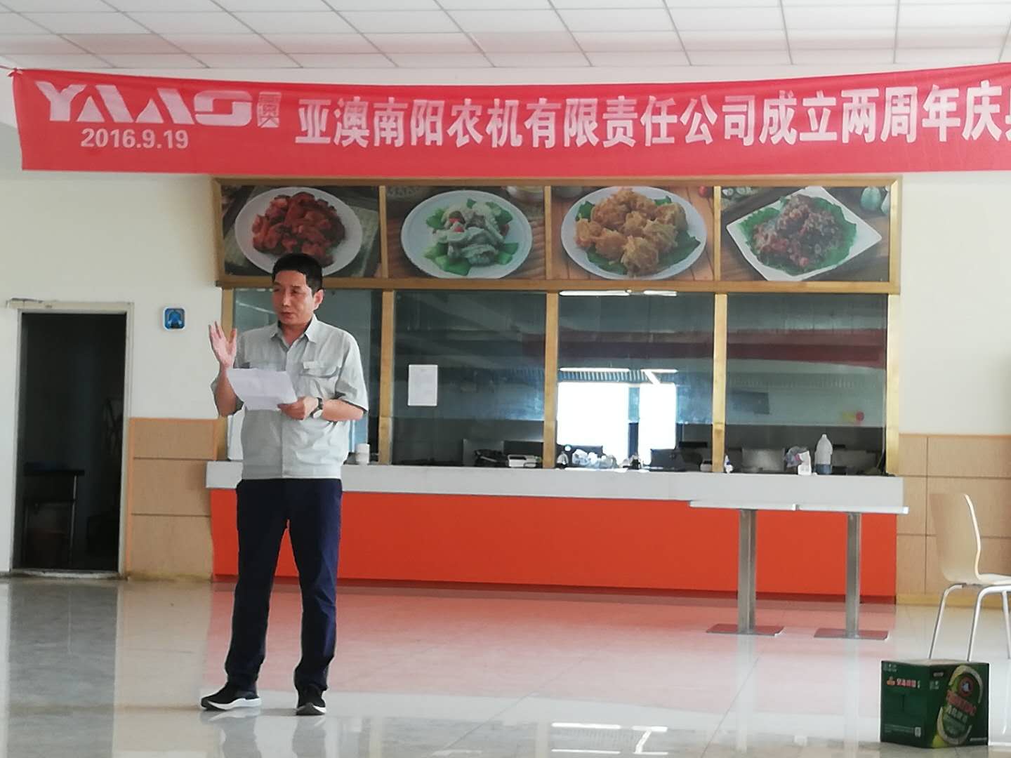 中秋佳節(jié)至,周年慶歡喜。2018923日,亞澳南陽農機有限責任公司開業(yè)兩周年慶典暨歡度中秋佳節(jié)活動在公司餐廳隆重舉行,因當天有生產任務,在不耽誤生產及各部門班組的全力配合下,慶典活動在中午12:00順利開始。