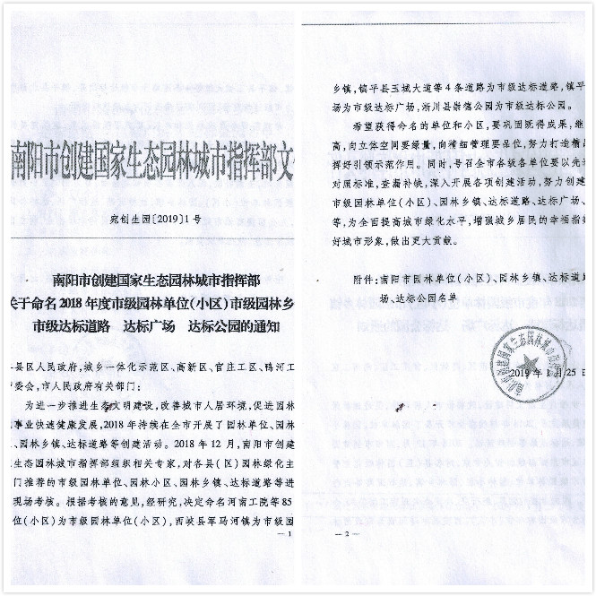 此次我公司喜獲 “南陽(yáng)市園林式單位”的榮譽(yù)稱號(hào),是市級(jí)主管部門(mén)對(duì)我公司優(yōu)美的綠色生態(tài)環(huán)境和園林綠化建設(shè)維護(hù)工作的高度肯定。我們會(huì)以此為新起點(diǎn),不斷加強(qiáng)生態(tài)環(huán)境建設(shè)和綠化養(yǎng)護(hù)管理工作,使廠區(qū)綠化特色更加顯現(xiàn),廠區(qū)綠化品位更上檔次,打造出更加優(yōu)美的生態(tài)園林廠區(qū)環(huán)境,為“國(guó)家綠色工廠”做好基礎(chǔ)。