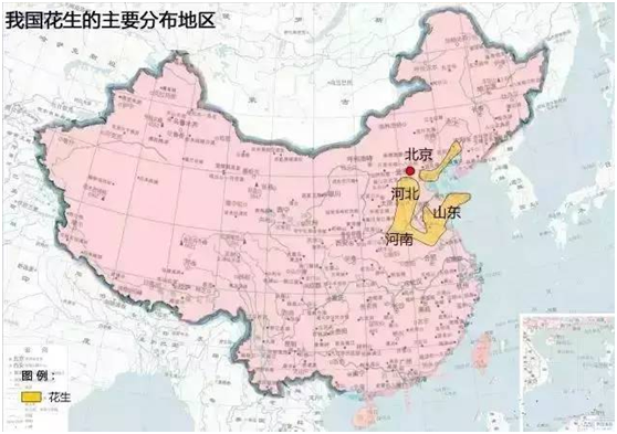 花生主要分布在我國東部的暖溫帶、亞熱帶、熱帶的沙土和丘陵地區(qū)